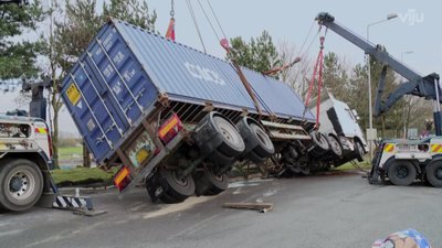 Heavy vehicle recovery team tackles a stuck 44-ton lorry on an embankment. RAC tech Mark rescues a stranded driver on a windy motorway bridge